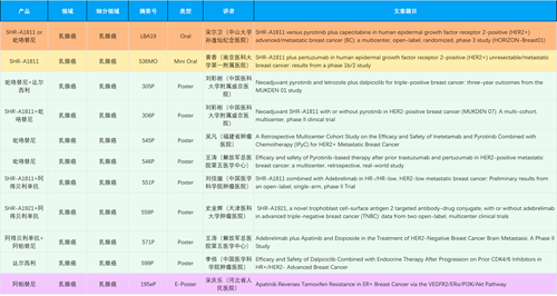 在乳腺癌领域,AG百家乐官网创新产品相关研究共入选1项口头报告、1项简短口头报告、8项壁报和1项电子壁报,共11项研究。吡咯替尼、达尔西利、阿得贝利单抗、瑞康曲妥珠单抗等新老创新药物,均有多篇研究入选,展现出AG百家乐官网医药在乳腺癌领域多年深耕的丰硕成果。