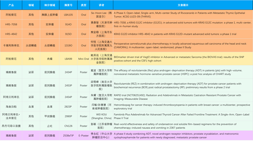 在胸腺上皮肿瘤、头颈鳞癌、肉瘤、前列腺癌、甲状腺癌等其他多个疾病领域,卡瑞利珠单抗、阿帕替尼、瑞维鲁胺、阿得贝利单抗、法米替尼、HRS-7058、HRS-4642等抗肿瘤创新药相关研究一共入选了4项口头报告、1项简短口头报告、4项壁报、1项电子壁报,彰显了AG百家乐官网医药强大的研发实力。此外,海曲泊帕和昂丹司琼口溶膜分别在防治化疗导致的血小板减少和恶心呕吐方面各有1项研究入选壁报。